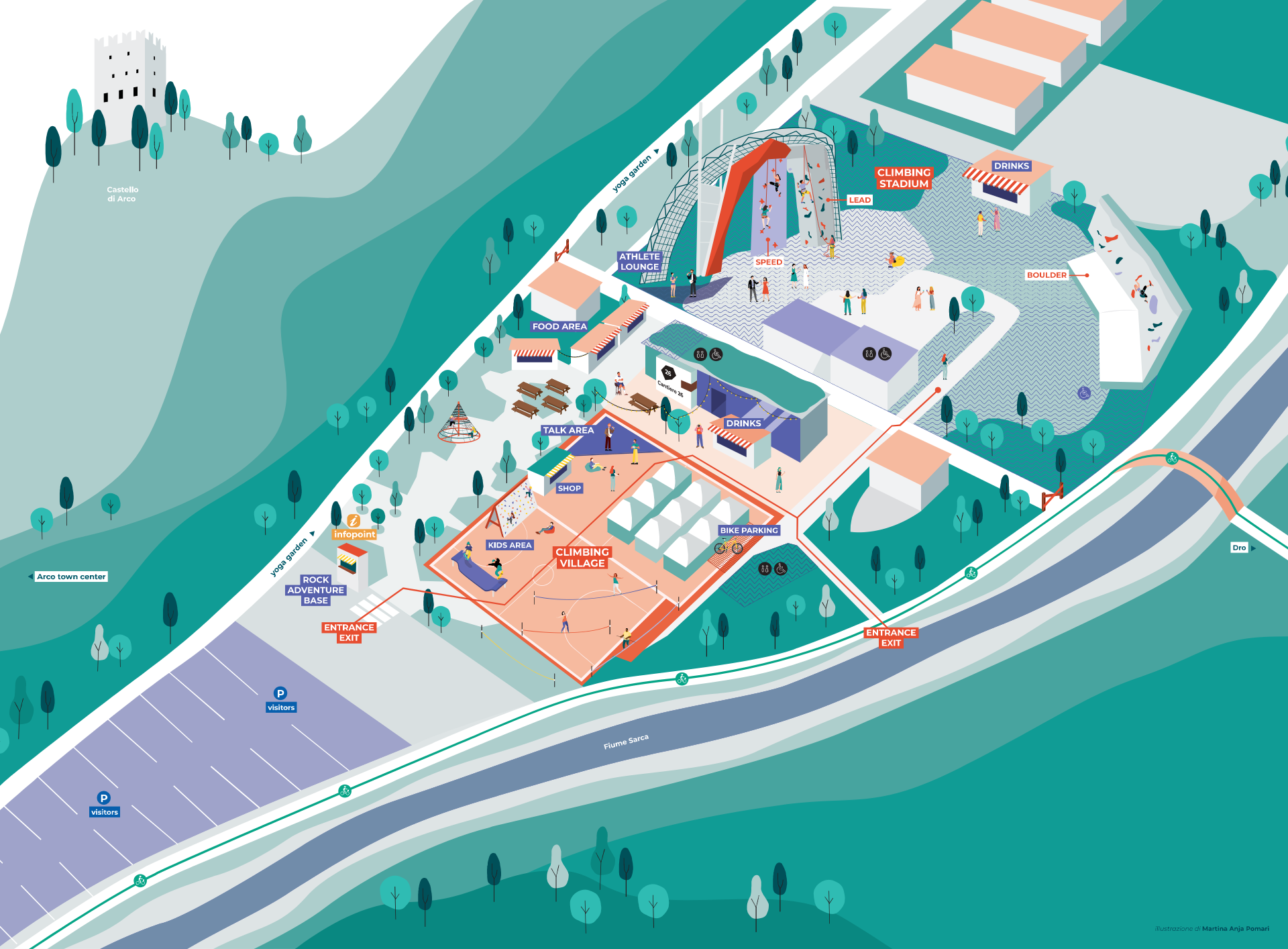 Rock Master isn’t just about the action on the wall. Surrounding the arena, you’ll find a real climbing village—a buzzing hub for climbing fans and curious newcomers alike.